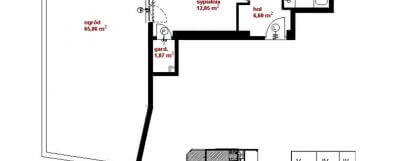 rooms: living room + kitchen, bedroom + wardrobe, bathroom, hall, garden 65.01 m2